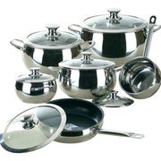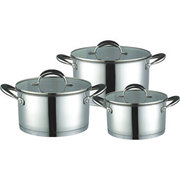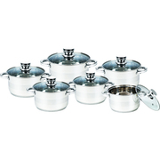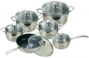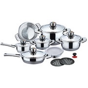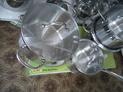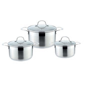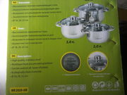 Набор посуды из высококачественной нержавеющей стали, 12-тислойное капсюльное дно., крышки с термодатчиками. Набор соединяется в пароварку. Набор состоит из 17 предметов: 3 кастрюли с крышкой (6, 8 л; 3, 8 л; 1, 6 л) сотейник с крышкой и ручкой (3, 2 л) кастрюля с крышкой и ручкой (1.