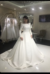 пышное свадебное платье белого цвета , 12 слоев юбки который не рвется , небольшой шлейф , шнуровка по всей длине спины , корсет твердый держит форму , верх кружевной , размер 44-46 , рост от 170 + каблуки , идет к платью подюпник 5 колец , есть дефект после химчистки немного пожелтел верх , больше фото скину по желанию.