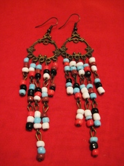 Серьги метал под бронзу, нанизаны цветные бусины (бисер) длинна с ушком 11 см..