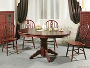 Удобный и практичный столовый комплект производства Малайзии состоит из массивного круглого стола (4260-2) и четырех стульев (221-с), изготовленных из натурального дерева гевеи.