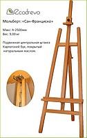 Мольберт с оригинальным и красивым названием «Сан-Франциско» изготовлен из карпатского бука. Эта прочная, твердая и надежная порода с давних времен используется для изготовления различных изделий из дерева, в том числе мебели, лестниц, элементов интерьера.