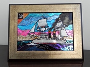 Серия «Парусники»: «Союз ветра и пара»( Парусный бронепалубный крейсер) Размер живописного поля: 180 х 130 (мм) Витражная картина выполнена витражными красками и контурами по стеклу.