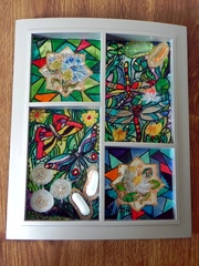 Размер живописного поля: 240 х 185 (мм) Необычная четырех-секционная композиции на тему симбиоза Трепетного и хрупкого Мира: воды и земли. Цветы.Бабочки.Стрекозы... Витражная картина выполнена витражными красками и контурами по стеклу.