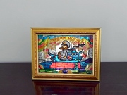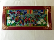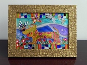Размер живописного поля: 150 х 210 (мм). Витражная картина выполнена витражными красками и контурами по стеклу. В современной анти-раме без каркаса. Яркая пёстрая солнечная рамка по краю изображена специальными красками по керамике.