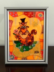 Серия «Кошкин Мир»: Денди. Размер живописного поля: 130 х 180 (мм) Витражная картина выполнена витражными красками и контурами по стеклу.Элегантный влюблённый английский кот в пенсне будет уместен как подарок для ценителей Европы и Великобритании в частности:) Для детей - это мифический персонаж.