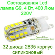 Светодиодная Led лампа G9 4W 400 Lm 220V вольт переменного напряжения. Аналог лампы накаливания 40 Вт. Световой поток 400 Lm. холодный белый, 32 диода 2835 корпус силиконовый Размер Ø16mm, длина 32mm, с ножками 48mm Корпус прозрачный силикон.