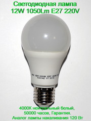Светодиодная лампа 12W 1050Lm E27 220V вольт с гарантией