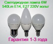 Светодиодная лампа 6W 540Lm E14, E27 220V вольт Гарантия