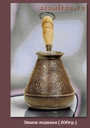 Турка медная. Объем 200мл.Знаки Зодиака 140.00 грн. Заказать Турка медная. Объем 200мл.Знаки Зодиака Кофеварки (Турки) изготовлены по уникальной технологии из листовой меди марки М1М (М2М) толщиной 1мм.