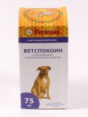 Ветспокоин с маточным молочком успокаивающее и противорвотное лекарственное средство на основе фенибута, прометазина и натурального пчелиного маточного молочка, обладающее мягким седативным, спазмолитическим, противосудорожным, анксиолитическим, стрессопротекторным, адаптогенным действием.