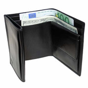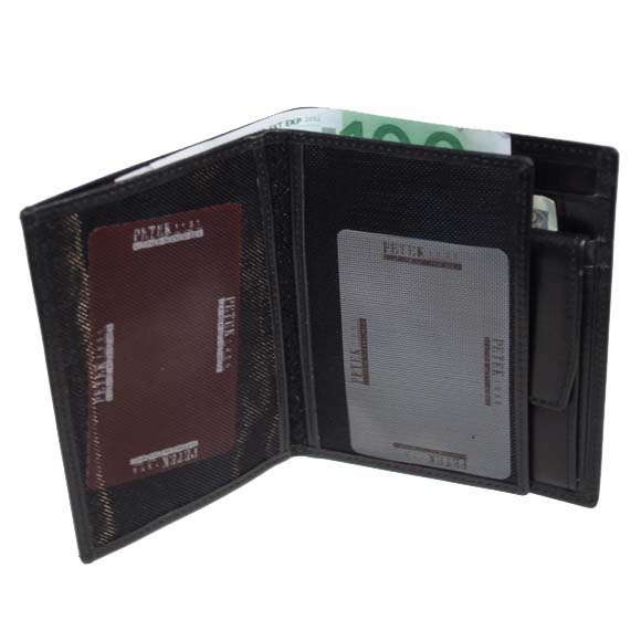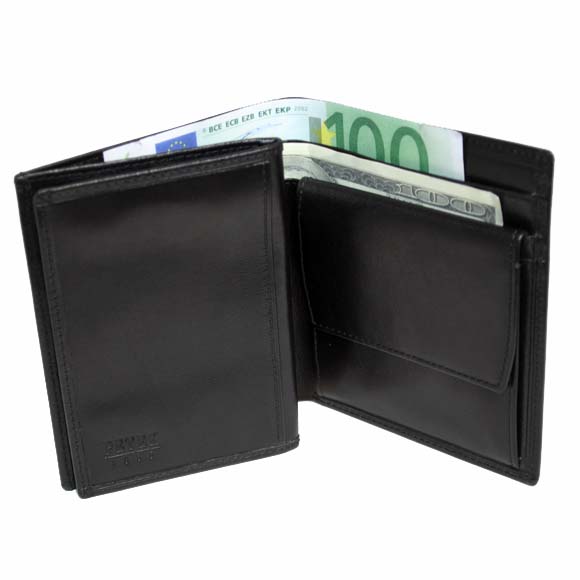 petek_117_black Портмоне мужское Габаритные размеры см: длина: 10.5 высота: 12 Описание кожи: кожа натуральная, гладкая Наполнение: 2 отделения для купюр монетница на кнопке 4 отделения для документов |