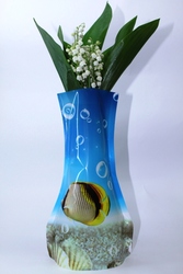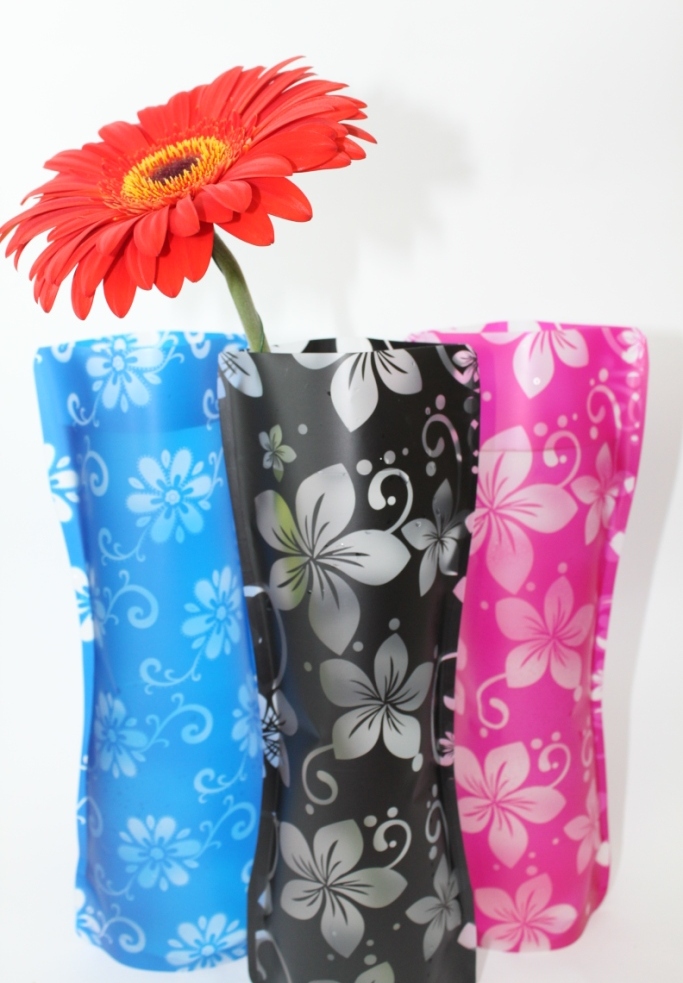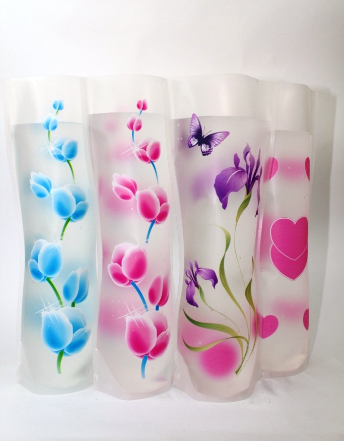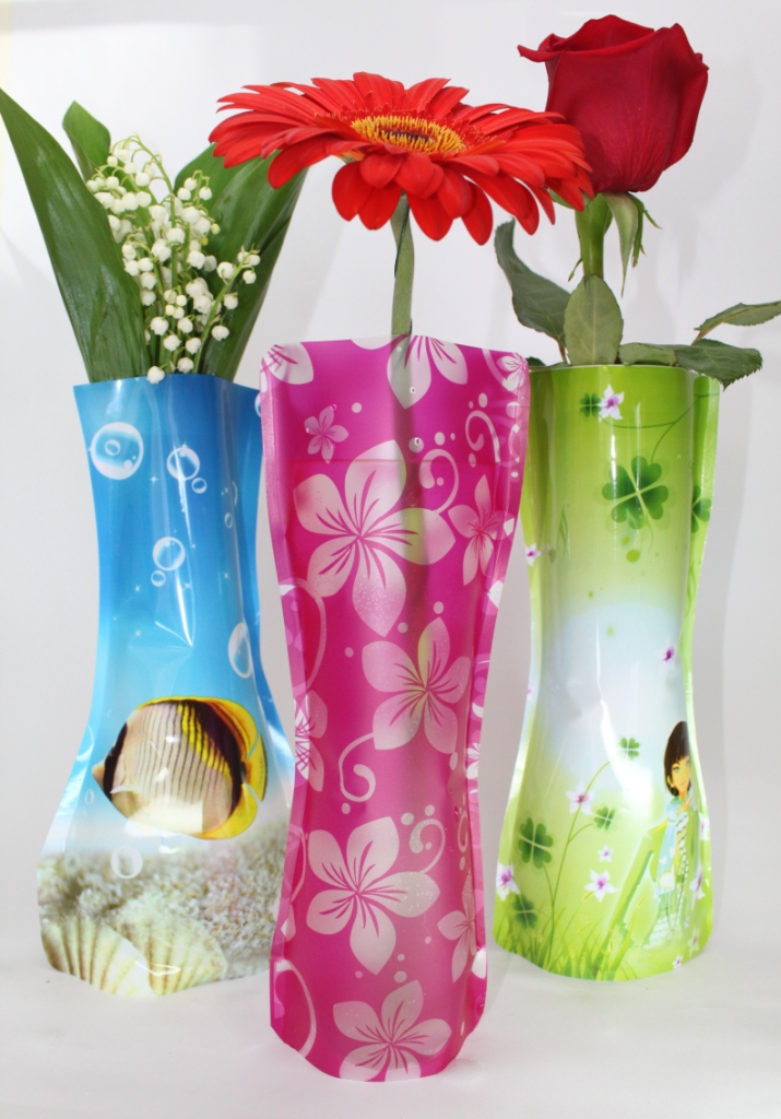 Пластиковые вазы производятся из плотного полиэтилена, в сложенном состоянии не больше листа бумаги, что дает возможность легкой транспортировки. При наполнении водой она приобретает оригинальную устойчивую форму, после чего в неё можно поставить букет цветов. В ассортименте огромный выбор дизайнов и размеров ваз.