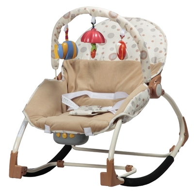 Кресло-качалка для детей от 1 мес. до 3 лет. Имеет 2 положения спинки, лежа и сидя. Съемная дуга с подвесными музыкальными игрушками и погремушками, для игры и развития ребенка. Игрушки можно менять. Имеются режимы вибро-укачивания ребенка, так называемый «режим колыбели». Хорошо успокаивает ребенка, оказывает легкое массажное действие и помогает ребенку уснуть.
