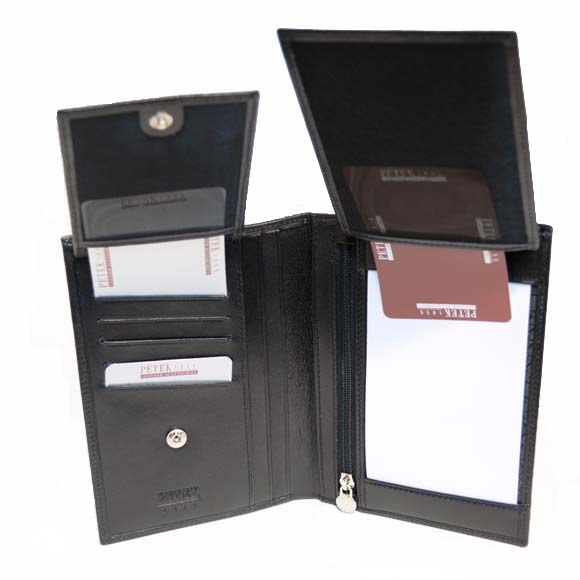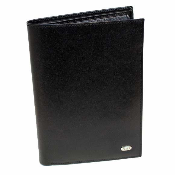 petek_305_black Портмоне мужское Габаритные размеры см: длина: 10.5 высота: 15 Описание кожи: кожа натуральная, гладкая Наполнение: 2 отделения для купюр монетница на молнии 6 отделений для карточек на кнопке 5 отделений для документов блокнот |