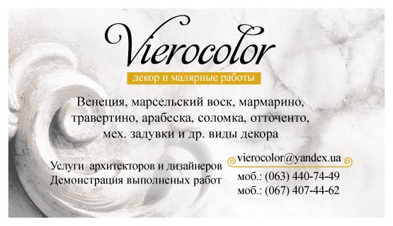 Компания «Vierocolor» предоставляет услуги декоративно-отделочных работ: венецианская штукатурка, марсельский воск, мармарино, отточенто и др. виды декора. Услуги архитекторов и дизайнеров. www.vierocolor.kiev.ua |