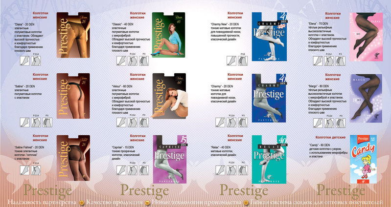 Предприятие с иностранными инвестициями «Полинит Текстиль» занимается производством носочно-чулочных изделий под торговой маркой «Prestige Продукция предприятия рассчитана на широкие слои населения. Ассортимент разнообразен: женские подследники, носки, гольфы и колготки от 15 до 80 den, включая женские колготы самых больших размеров(5 и 6). Брэнд «Prestige» уже многие женщины знают и полюбили. Предприятие работает со многими крупными фирмами г. Киева и Украины.