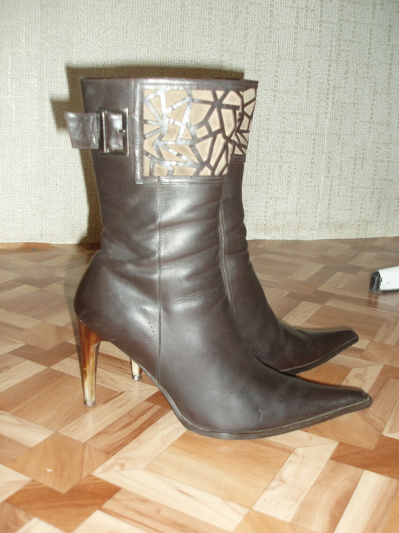 Коричневые кожаные сапожки с бежевой замшевой декоративной вставкой. Красивые . В отличном состоянии. Высота шпильки - 9см. Очень практичные и удобные. |