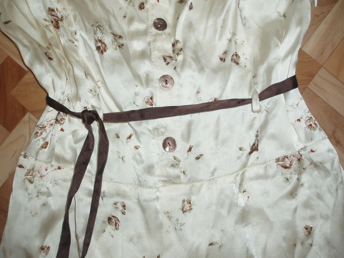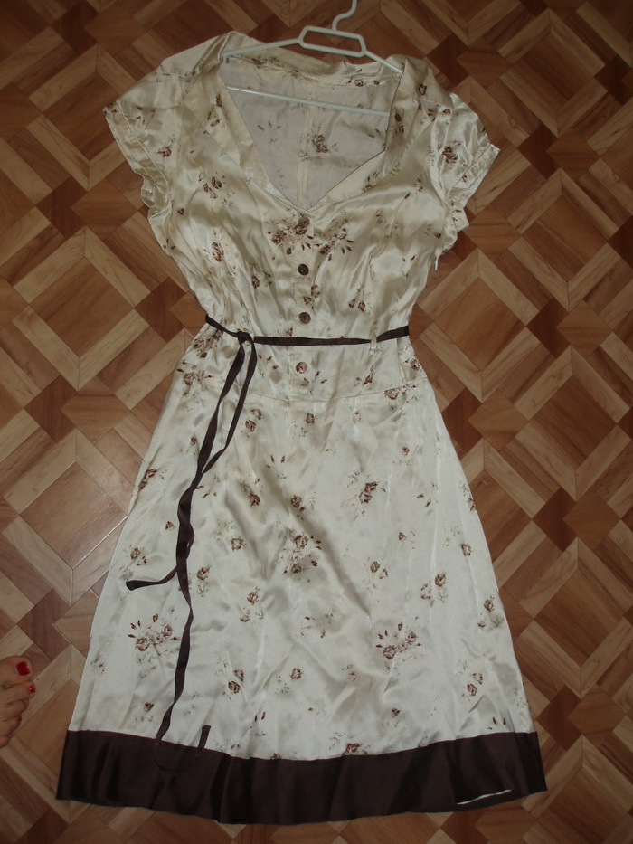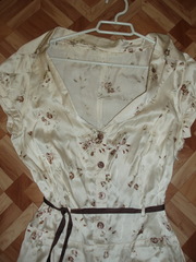 Размер: S Платье из натурального индийского шелка. Пуговицы - натуральный перламутр. Коричневая отделка - тоже шелк. Одевалось 1 раз. Оригинальный покрой, очень красивое. Длинна - середина колена. Рукав фонарик. Красивое декольте на грудь 2р. Размер S. Шилось по индивидуальному заказу - не будет "близнецов". |
