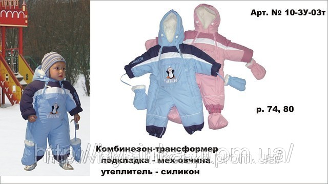 Детский комбинезон-трансформер — это необычайно удобная вещь! Родители, уже знакомые с такой вещью, никогда не променяют его. Когда ребенок совсем маленький, комбинезончик закрывает ему ножки и предоставляет простор и удобство во время пребывания в коляске. Стоит ребенку встать на ноги и научиться ходить, как комбинезон застегивается по-другому, и получаются ножки — ребенок может бегать, играть. Молния изготовлена специально для таких целей и не продувается. 2 такие же молнии проходят по туловищу. Яркий конвертик с веселыми пингвинчиками украшает модель, делает ее более привлекательной и веселой. Благодаря современному синтепону с силиконовой пропиткой и натуральной овчине, мамы могут быть спокойны за температурный режим своего малыша. Такие утеплители не пропустят холода. Варежки на резиночках и отдельные непромокаемые ботиночки!