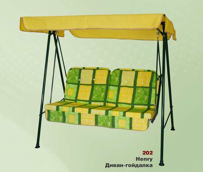 Максимальная нагрузка: 200 кг Размеры: 180х118х153 цена: 1400 грн. Производитель: Италия Основа сидения каркаса: Мешковина Диван-качеля Henry (хлопок) 3-месная, стальной каркас, порошковая краска зеленого цвета. Мягкая часть: поролон, ткань-хлопок 100%. Высота качели 153 см, ширина сидения 135 см, расстояние между ножками 180 см. Размеры каркаса в сложенном виде: 168*30*7 см, вес 20 кг, матрасы: 134*49*13см, вес 4кг. Не раскладывается. http://mebli-raduga.kiev.ua/product/divan-kachelja-genri/ |