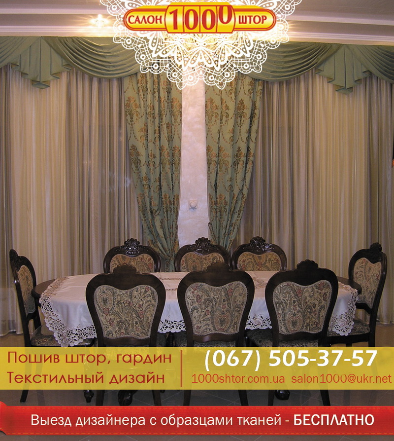 Шторы Киев. Ламбрекены. Салон 1000 штор предлагает изготовление штор из наших тканей по индивидуальным эскизам для детской комнаты, спальни, гостинной, шторы для кухни. Принимаем заказы на рулонные шторы, жалюзи, римские шторы, японские шторы. У нас большой выбор карнизов: металлические, пластиковые, деревянные. предлагаем ткани на любой кошелек. Выезд дизайнера с образцами тканей по Киеву, бесплатно. http://www.1000shtor.com.ua (067) 5053757 |