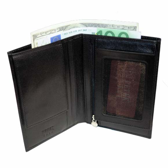 petek_305_black Портмоне мужское Габаритные размеры см: длина: 10.5 высота: 15 Описание кожи: кожа натуральная, гладкая Наполнение: 2 отделения для купюр монетница на молнии 6 отделений для карточек на кнопке 5 отделений для документов блокнот |