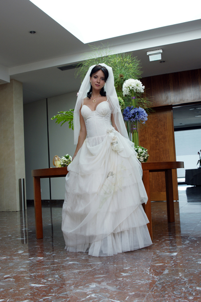 Дизайнерское платье. Сшито в Португалии. Облегченый корсет, легко перешить, если необходим размер меньше, только итальянские ткани, органза с цветами изготовлена "под заказ". Драпировка на платье выполненна вручную. Цвет-айвори. Одевалось 1 раз. После химчистки. В идеальном состоянии. тел: +380504105025 Возможен торг. |
