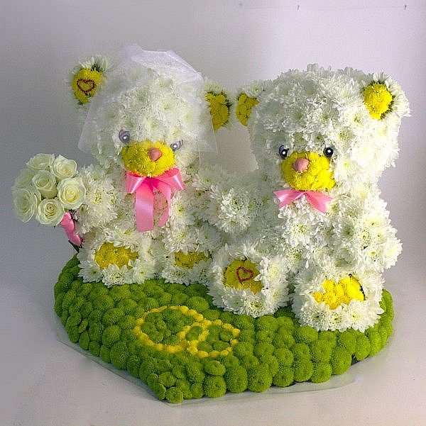 Игрушки из цветов вполне уместны и на свадьбе. Пара очаровательных зверушек, с любовью смотрящих друг на друга, приведет в умиление жениха с невестой и всех гостей.
