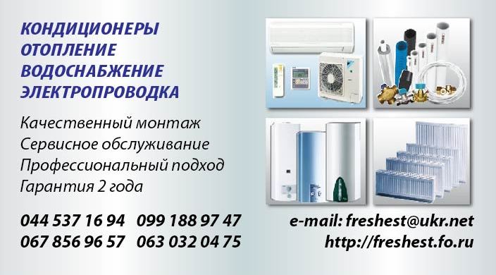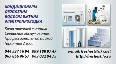 Установка и обслуживание Кондиционеров, Систем Отопления, Водоснабжения, Электропроводки: 1)Грамотная разработка проэкта 2)Закупка материалов по ценам ниже рыночных на 20% 1)грамотный монтаж и инструктаж. 2)техническое обслуживание (настройка, диагностика, регулировка, чистка, заправка). 3)Ремонт любой сложности. 4)Низкие цены (Монтаж кондиционера стандартный 700грн.) 5)Быстро, качественно - установка, Крепёж, Подключение, Запуск, Консультация, Гарантия на монтаж 2 года. 044 535 16 94 / 099 188 97 47 / 063 032 04 75 / 067 856 96 57 / FRESHEST@UKR.NET |