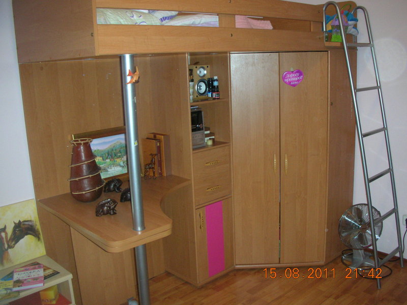 все необходимое для школьника в одном цельном модуле польского производства:шкаф угловой,кровать односпальная с ортопедич. матрассом,стол письменный увеличивающийся,пенал,выдвеж.ящики,идеальна для маленьких комнат,нагрузка на второй этаж 120 кг. |