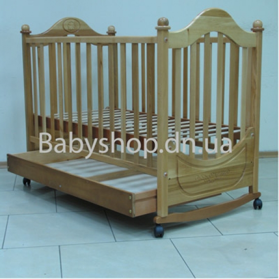 Тщательная полировка и, как результат, безупречная поверхность детской кроватки. Покрытие выполнено лаками и красками, отвечающими требованиям безопасности. В кроватке Мальва предусмотрена возможность установления верхнего (для очень маленьких детей) и нижнего уровня днища (для тех малышей, которые научились вставать на ножки). Передний бортик (повреждена одна направляющая) детской кроватки опускается или, при желании, снимается полностью, так что кровать может использоваться как диванчик, а без колес - как люлька. |