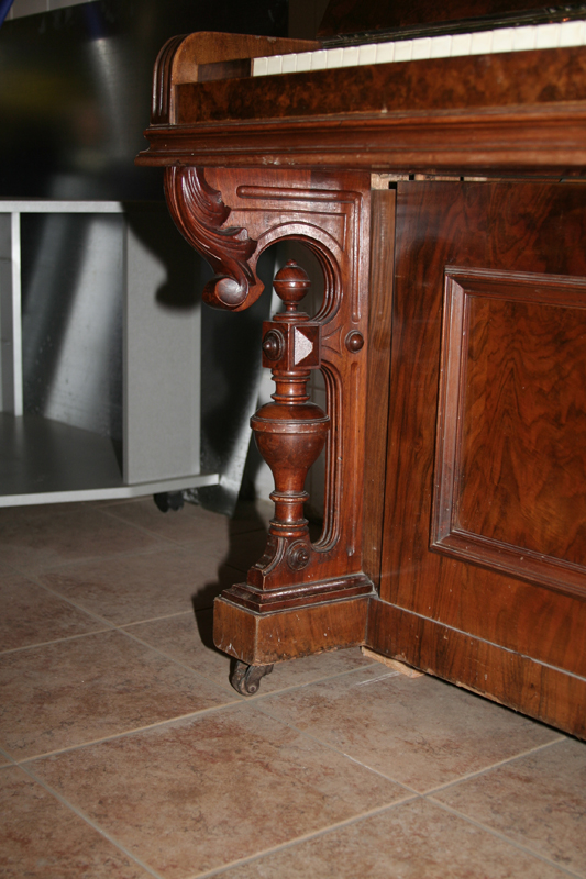 Очень изящное, темно-орехового цвета, небольшого размера, хорошо сохранившееся, полностью рабочее, идеальное звучание. Требуется только настройка. |