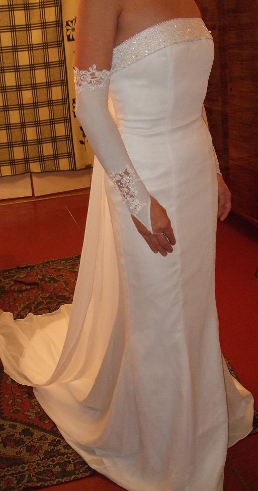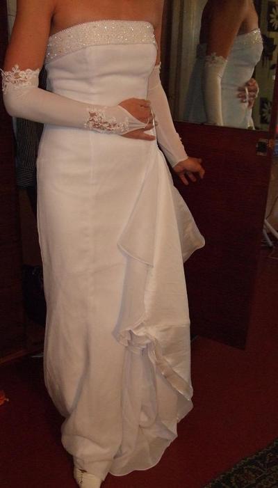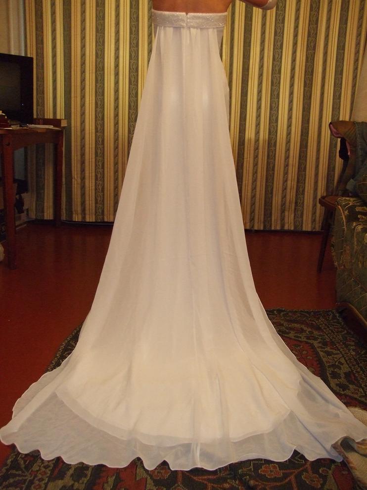2 нижних яруса платья – из белоснежной переливающейся плотной ткани, верхний ярус – из тонкой прозрачной ткани. В верхнюю часть платья внутри вертикально вшиты мягкие «косточки».Сзади платье застегивается на молнию, а на уровне лопаток к платью крючками (незаметно) крепится шикарный шлейф с легкого прозрачной ткани. И шлейф, и низ платья при желании можно подобрать на руку (с изнанки есть петелька из тонкой ленты для продевания на руку). Верх платья обшит переливающимися камушками и бисером (вытянутым и круглым в виде маленьких жемчужин).