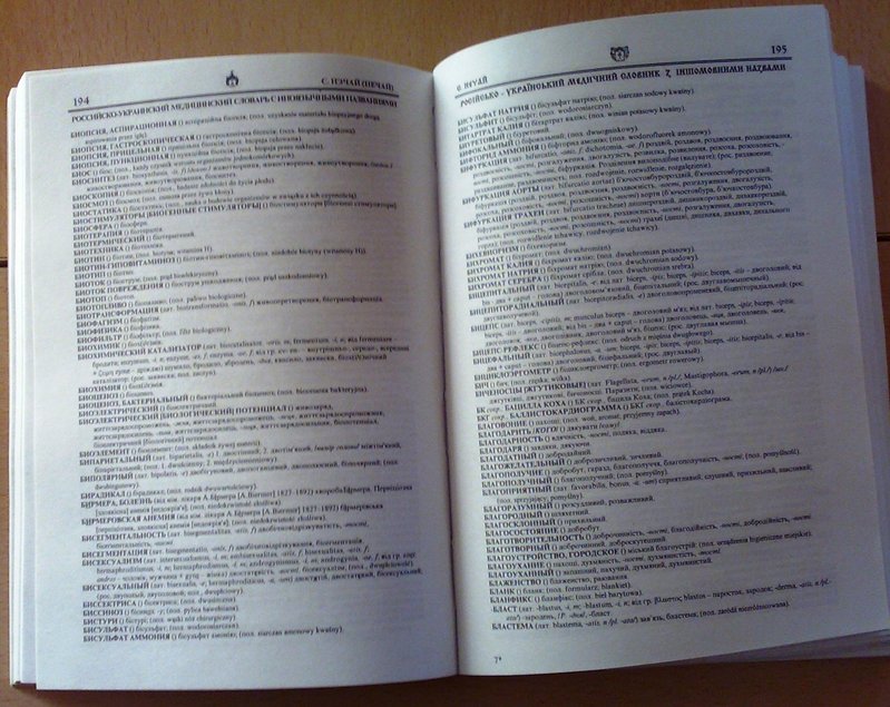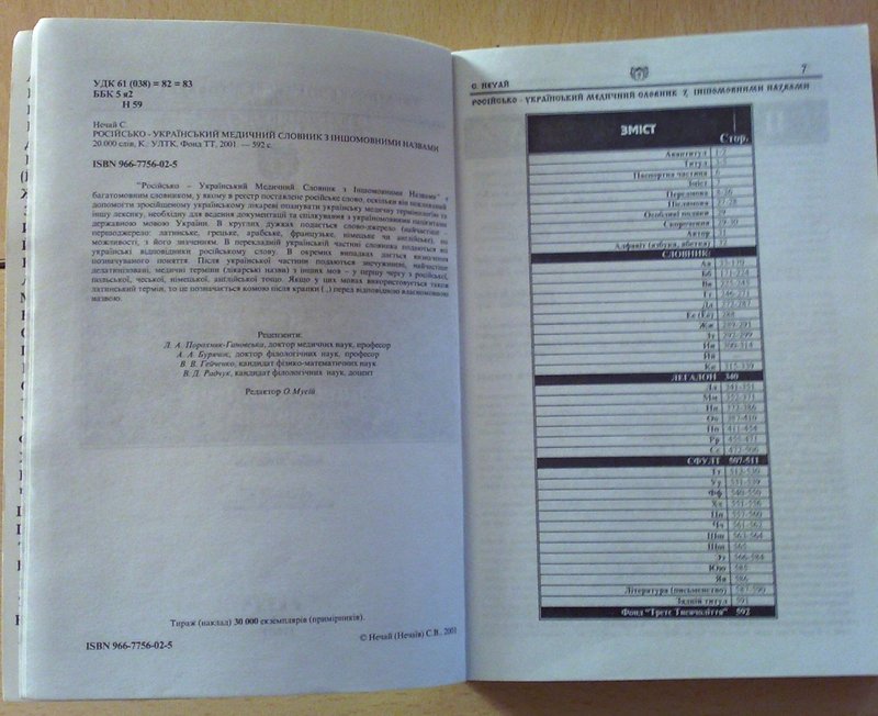 С.Нечай «Російсько – Український Медичний Словник з Іншомовними Назвами» 20 000 слів, К.: УЛТК, Фонд ТТ, 2001. – 592с. размеры (см) 20*14*2,5, книга нова. Словник, у якому в реєстр поставлене російське слово, оскільки він покликаний допомогти зросійщеному українському лікареві опанувати українську медичну термінологію та іншу лексику, необхідну для ведення документації та спілкування з україномовними пацієнтами державною мовою України. В круглих дужках подається слово джерело (найчастіше – першоджерело: латинське, грецьке, арабське, французьке, німецьке чи англійське), по можливості з його значенням. В перекладній українській частині словника подаються всі українські відповідники російському слову. В окремих випадках дається визначення позначуваного поняття. Після української частини подаються знечужинені, найчастіше делатинізовані, медичні терміни (лікарські назви) з інших мов – у першу чергу з російської, польської, чеської, німецької, англійської тощо. Якщо у цих мовах використовується також латинський термін, то це позначається комою після крапки(.,) перед відповідною власномовною назвою. |