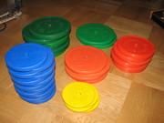 Цветные диски-веса в пластиковой оболочке (подходят для тренажёра, штанг и гантелей) и грифы. Производители "Интератлетика" и VASIL.