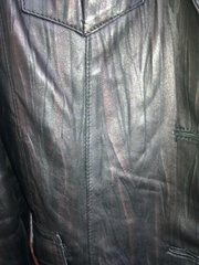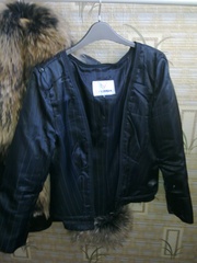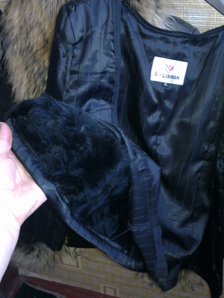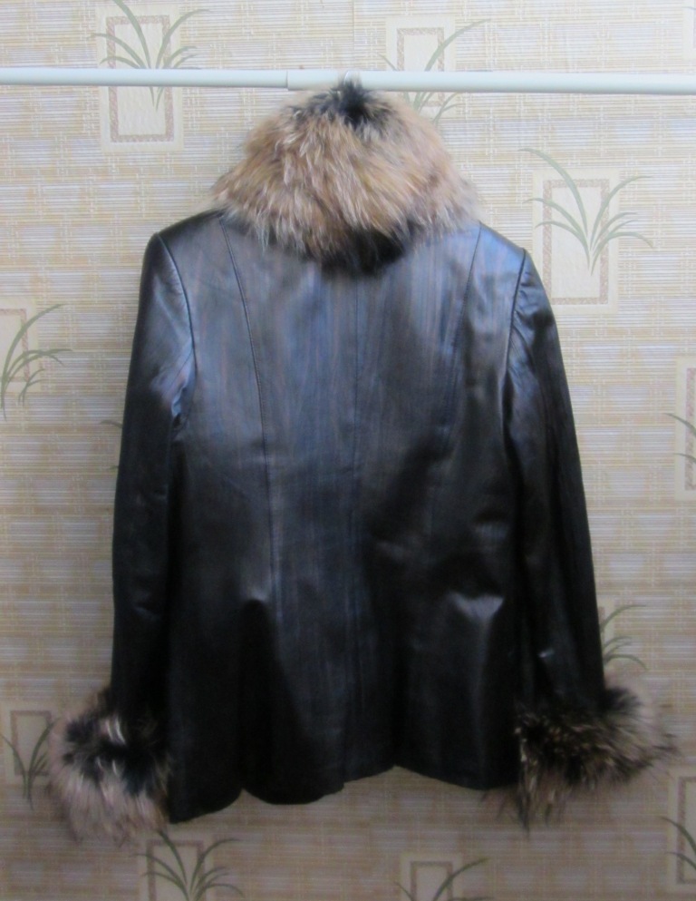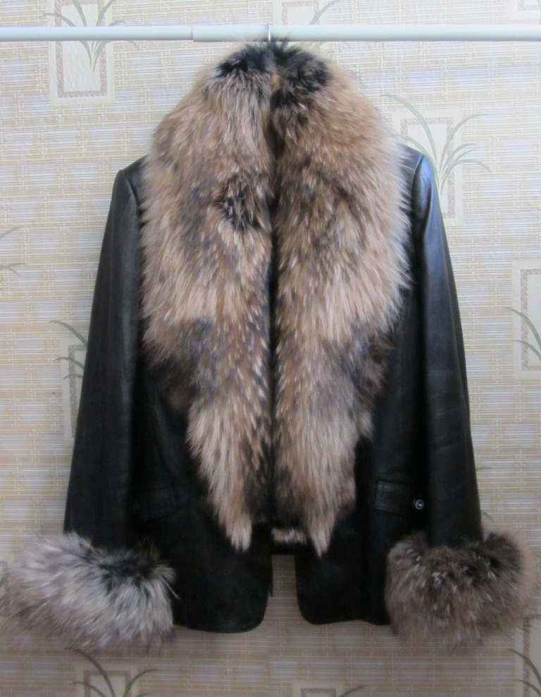 Кожаная куртка на пуговицах, с мехом енота на воротнике и рукавах (весь мех съемный), подстежка на кроличьем мехе снимается и получается кожаный пиджак на весну и осень. Цвет коричнево-черный, кожа слегка жатая. Куртка в отличном состоянии, носилась совсем мало. Размер XL. |