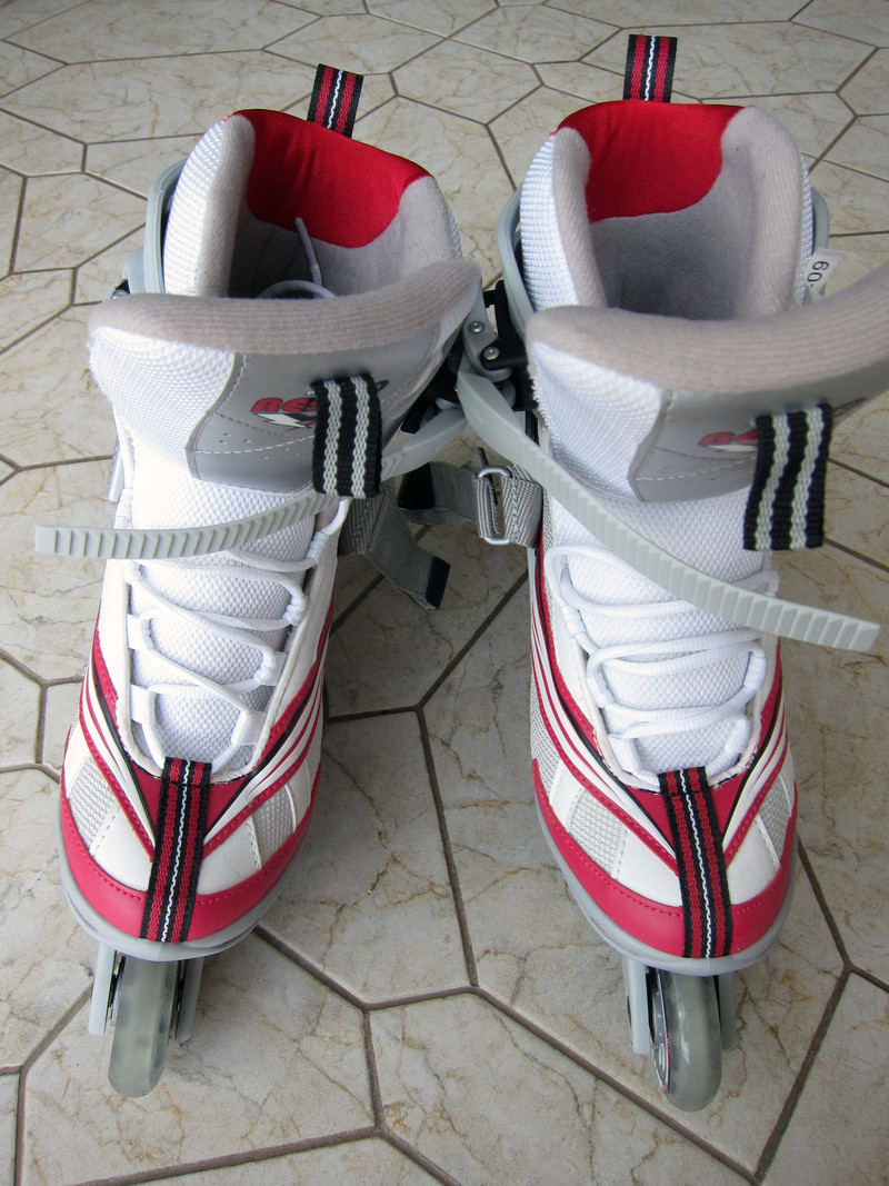 2. Женские ролики RE:action R052W, размер 39 (на ногу 37 размера). В отличном состоянии, в коробке. Цвет: серо-красные. Рама: Полипропилен. Подшипники: ABEC 3. Колеса: полиуретановые, размер 78 мм, жёсткость 80A. Застежка: Микрометрическая бакля / Шнуровка / Velcro липучка.