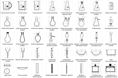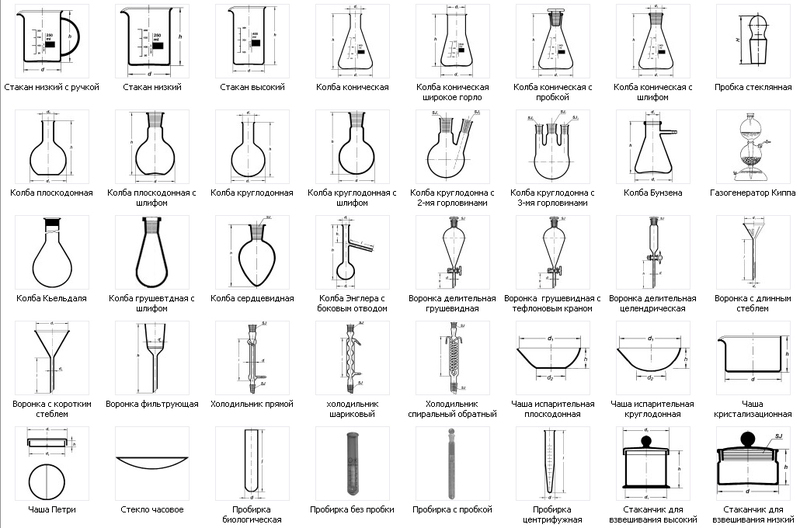 Стаканы, колбы, пробки, воронки, чаши испарительные, чаши кристаллизационные, пробирки, чаши Петри, сосуды колоколообразные, эксикаторы, флаконы капельные, бутылки для реагентов, стаканчики для взвешивания, бутыли Вульфа, бутылки с винтовой крышкой, керны, муфты стекла предметные, стекло покровное, камера Горяева, сушка для посуды, столик подъемный, горелка Бунзена, кюветы, щипцы тигельные, мензурки с ручкой полипропиленовые, тигли фарфоровые, кастрюля с ручкой фарфоровая, чаши испарительные фарфоровые, воронки Бюхнера, ступка с пестиком фарфоровая, бани водяные, испарители ротационные, центрифуги, весы лабораторные, магнитные мешалки, колбонагреватели, ph – тестеры, таймер электронный, термометр электронный, и многое другое.