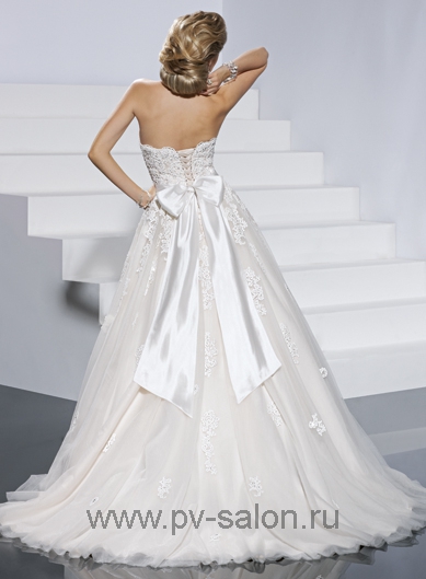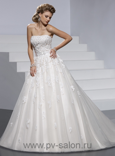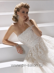 Великолепное свадебное платье Dorothy доподлинно передаёт стиль Голливуда 30-40-ых годов, весомый вклад в развитие которого внесла американская актриса немого кино Дороти Гибсон. Тюль, расшитый тончайшим кружевом, создаёт абсолютную иллюзию воздушности. Отдельные элементы вышивки, украшающие бальную юбку, навевают мысли о цветочных лепестках, которые уносит ветром. Атласный пояс завязывается сзади в роскошный бант. Разбросанные по всему платью кристаллы Swarovski и жемчуг переливаются на солнце, подчеркивая богатство кружев. http://madeline.com.ua/svadebnyie-kollekczii/maggie-sottero.html |
