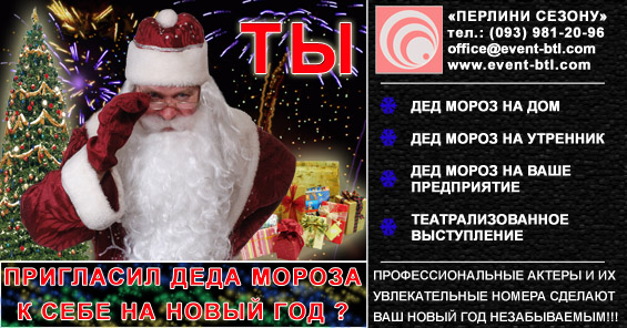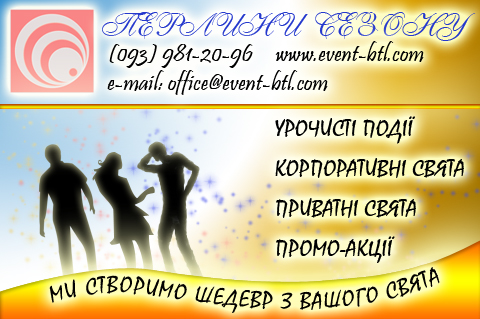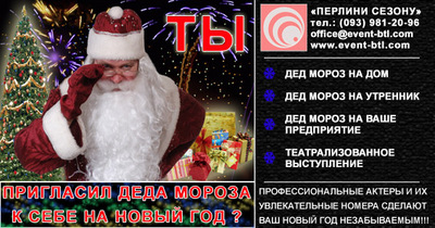 Event-Компания "Перлини сезону" предлагает Вам: • организацию и проведение промо, btl -акций для любых видов товаров, в любой торговой сети Киева, на улицах города, открытых площадках и в общественных местах. • организацию корпоративных мероприятий; • Дед Мороз и Снегурочка на дом, в офис, на корпоративное мероприятие. Сайт: http://event-btl.com E-mail: office@event-btl.com |