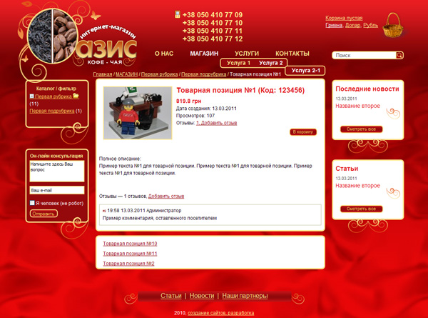 Создание сайта интернет-магазин, оформление заказа, поиск, импорт ассортимента товаров из файла, модули: «Обратная связь + онлайн консультация», «Новости», «Голосование», «Отзывы», «Поиск», «Регистрация посетителей», «Статистика посещений»