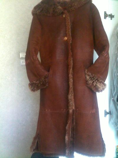дубленка натуральная с капюшоном и карманами. длина-за колени. цвет:темно-рыжий. сидить по фигуре. ц.2450 грн. |
