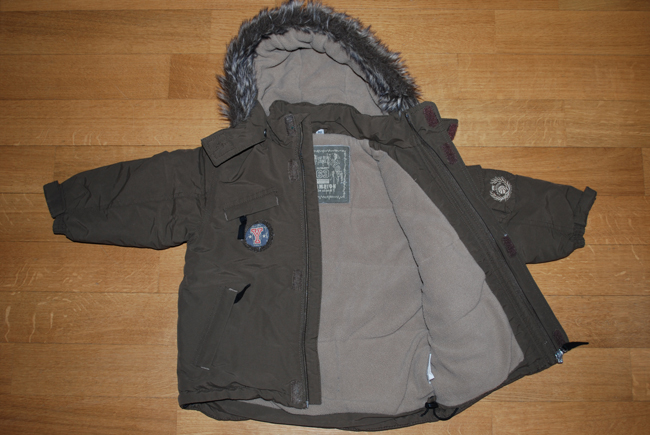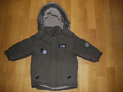 Теплая зимняя куртка рост 92. длина по спинке 49см, длина рукава 30 см, съемный капюшон, флисовая подкладка. |