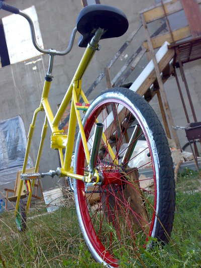 Велочопер только что после покраски. Покрашен в зелёно-желто-красный цвет. Длина передней вилки 1,2 метра. В комплекте также две "выхлопные" хромированые трубы. Вы не останетесь незамечеными, обещаю)) |