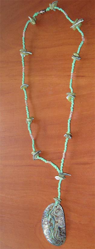 11. Бусы с подвеской из натуральной раковины «Напоминание о море». Бисер, камни, ракушки, металлическая закручивающаяся застежка. Длина с застежкой 28 см. Длина подвески 8,5 см. Цена 25 грн.