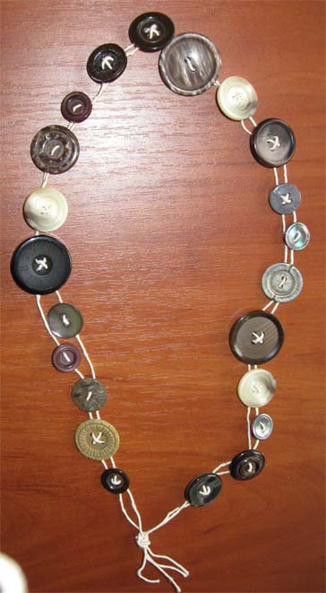 13. «Пуговки». Для любителей альтернативы и эпатажа. Может использоваться как бубы, как и как браслет. Нить, пуговицы. Длина 62,5 см. Вокруг запястья свободно оборачивается 3 раза. Цена 10 грн.