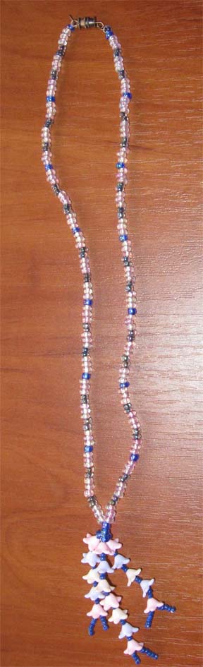 16. Бусы с подвеской «Цветочная гроздь». Бисер, пластиковые бусины «цветы», закручивающаяся металлическая застежка. Длина с застежкой 49,5 см. Длина подвески 6.5 см. Цена 20 грн.