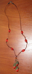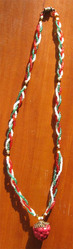 23. Подвеска «Малинка». Бисер, стеклянные бусины, металлическая фурнитура, пластика, металлическая закручивающаяся застежка. Длина с застежкой 48,5 см. Длина подвески 2 см., ширина 1,5 см. Цена 30 грн.
