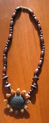 20. Бусы «Подсолнух». Деревянные бусины, пластиковая подвеска, металлическая закручивающаяся застежка. Длина 44 см. Цена 30 грн.