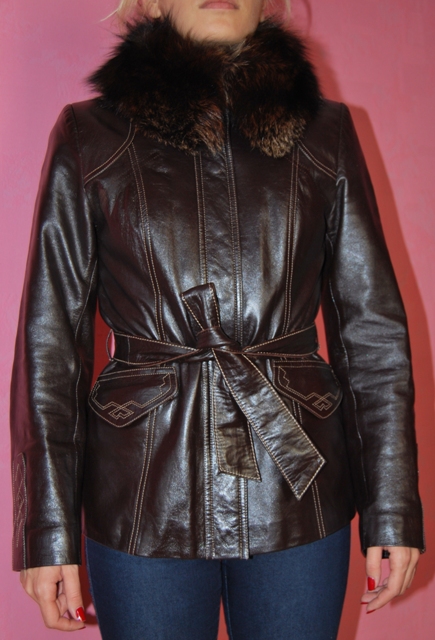 Пальто кожаное, укороченное. Цвет - шоколад. На подкладке из тонкого материала. Воротник - стойка, пристегивается воротник из меха лисы. Размер - 36. Состояние - отличное. |